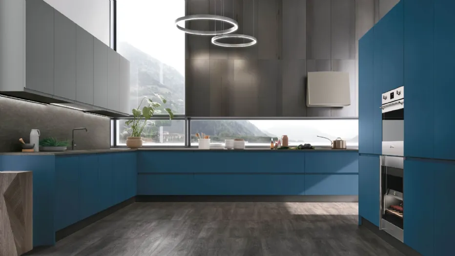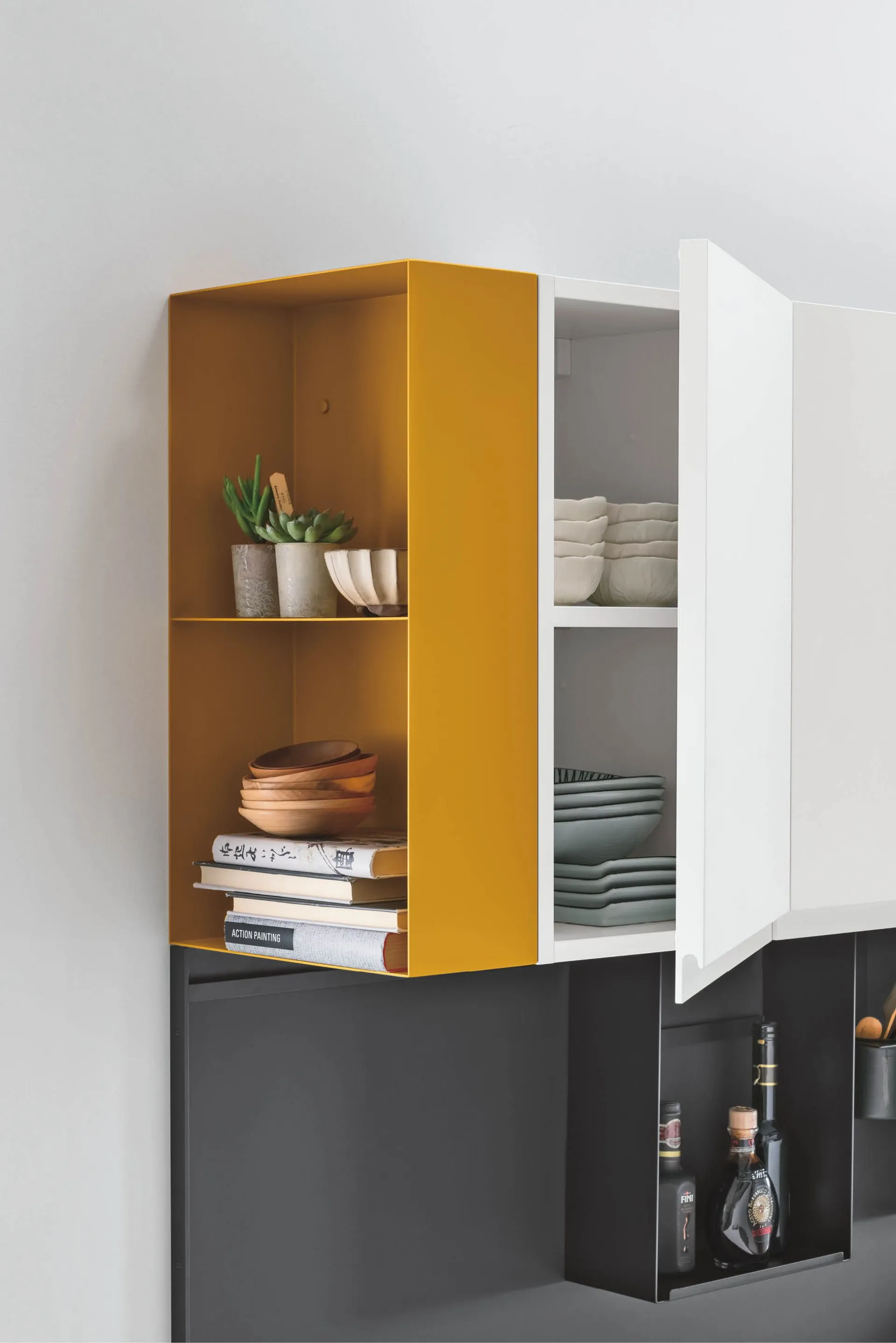 Il vano a giorno trova posto in più punti della cucina. Tra le colonne, apre gli spazi di contenimento e dà un tocco di colore. In testa al pensile, diventa un elemento esteticamente accattivante. Inoltre, l’anta copre la profondità del vano a giorno: quando è chiusa, lateralmente si nota solo il profilo colorato molto sottile, mentre frontalmente l’elemento non si vede.